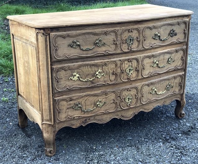 A fabulous early French commode chest of drawers, dating to the 18th Century and made from solid oak, all totally original including the wonderful back boards. She is serpentine in form with lovely decorative design to the front, the drawers all run smoothly and fitted with original handles.