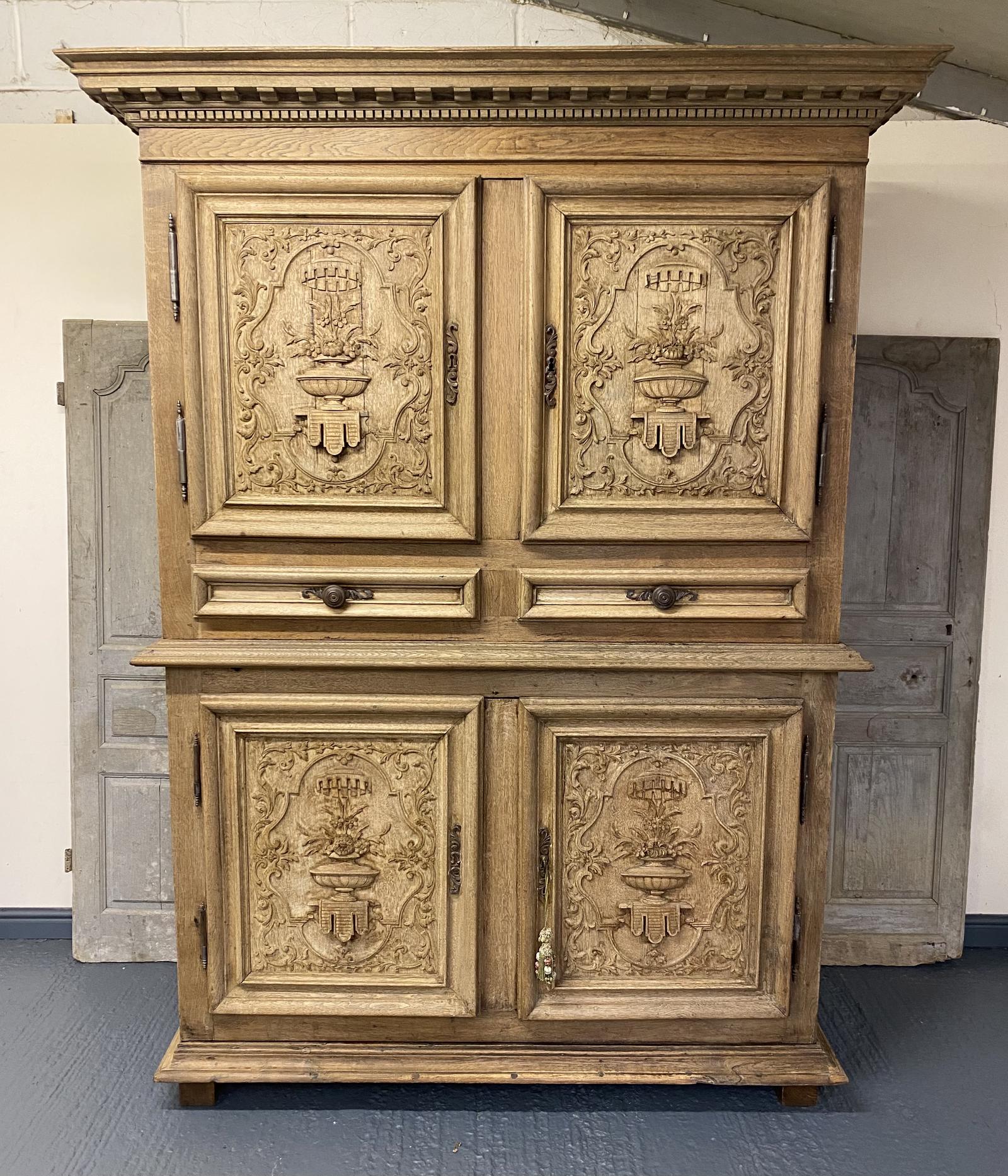 A wonderful French Larder Cupboard, from the Normandy region and dating to the late 18th Century. Made from solid Oak which we have lightly bleached to give it a fresh look. Superb carved doors and original hardware this piece has a great look and also highly practical. It comes apart for easier access into the home.