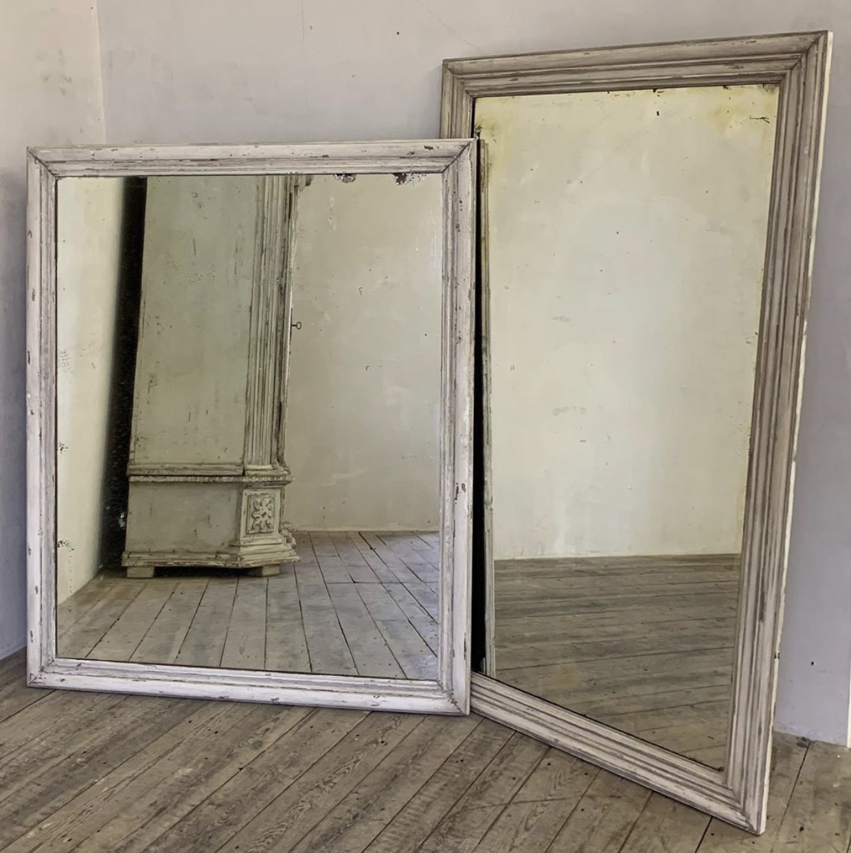 A lovely near pair of antique French large white mirrors, 19th Century and having original plates.