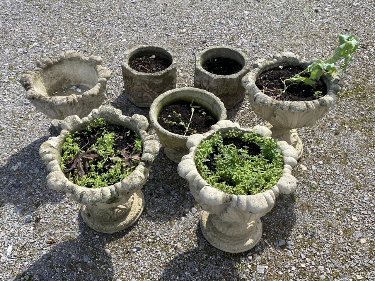 A nice collection of 7 Garden planters. Comprising a set of 3 cabbage urns, another cabbage urn, a pair of hexagonal planters and a basket design planter.