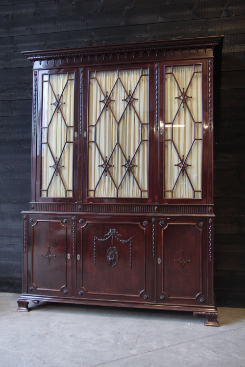 A superb quality Edwardian Library Bookcase. The 3 glazed doors open to reveal bookshelves, the silk behind the glass is easily removed to have your books on show. The Mahogany is fine Cuban and all the Adams carved decorative features are of excellent quality.