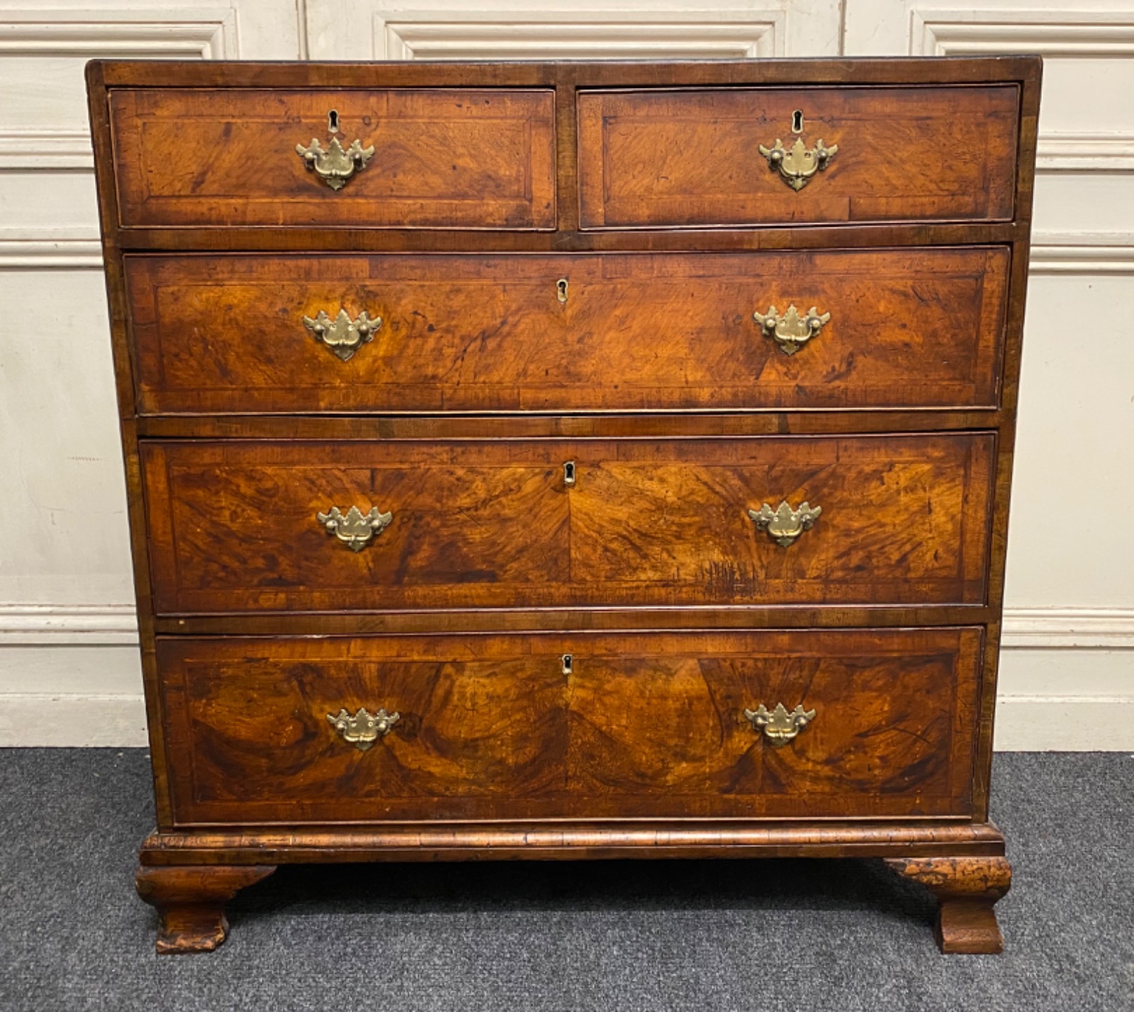 A lovely chest of drawers having wonderful original Walnut colour and patina. All the drawers run smoothly fitted with the original handles. Made from Walnut with Burr to the fronts and top and cross banded also. The drawers are made from oak, original oak back.