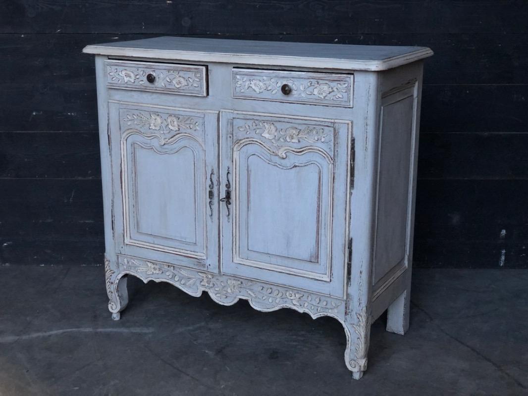 A delightful French decorated 2 door buffet or cupboard. Made in the mid 19th Century from solid oak. The 2 drawers run smoothly and fitted with original hardware.