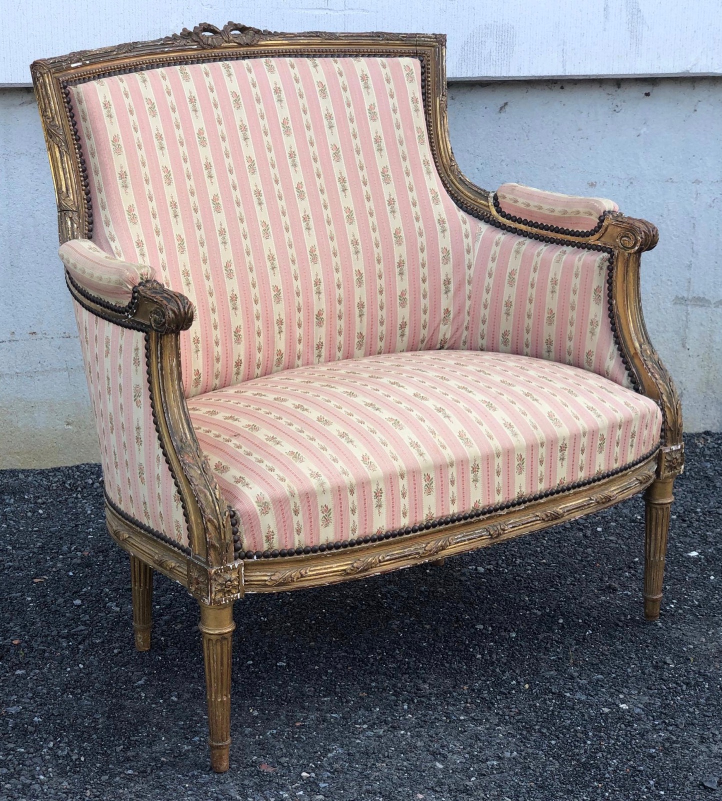 A lovely Napoleon III French oversized giltwood armchair or marquise chair or small couch. made from wood, gesso and gilt the chair is highly decorative and very rare in this size. The frame is strong and sturdy and the upholstery is in very good condition, it is also extremely comfortable.