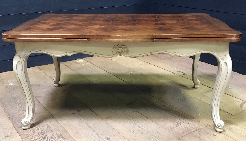An excellent quality French Dining Table made from Walnut and not to be confused with the lesser Oak later models of this style of table. The Parquetry top is a lovely Walnut colour with nice patina, the base is original paint. The 2 leaves pull out from each end and make this a large table easily able to seat 10 people.