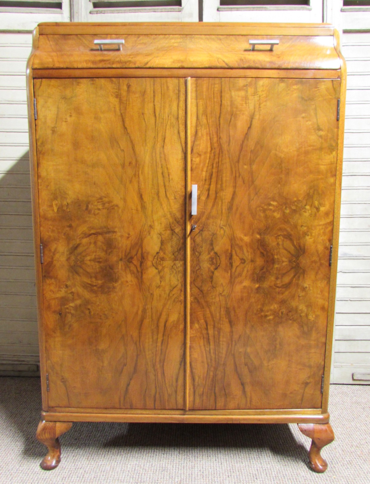 A very stylish Art Deco Cabinet or Cupboard having surprise storage drawers inside. Made from Walnut with Burr Walnut to the front. The top roll over drawer runs smoothly and the 2 lockable (key present) doors open to reveal 3 storage drawers inside. She sits on little Queen Anne feet.