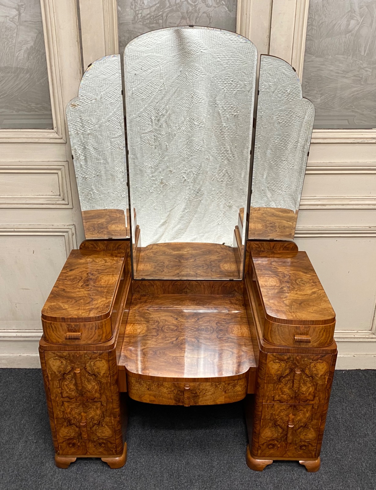 A superb quality Art Deco dressing table, made from walnut with excellent burr walnut, dating to 1930. Very good quality construction. The mirrors are in very good condition and we have re finished the whole piece to a very high standard so in excellent condition for the home.