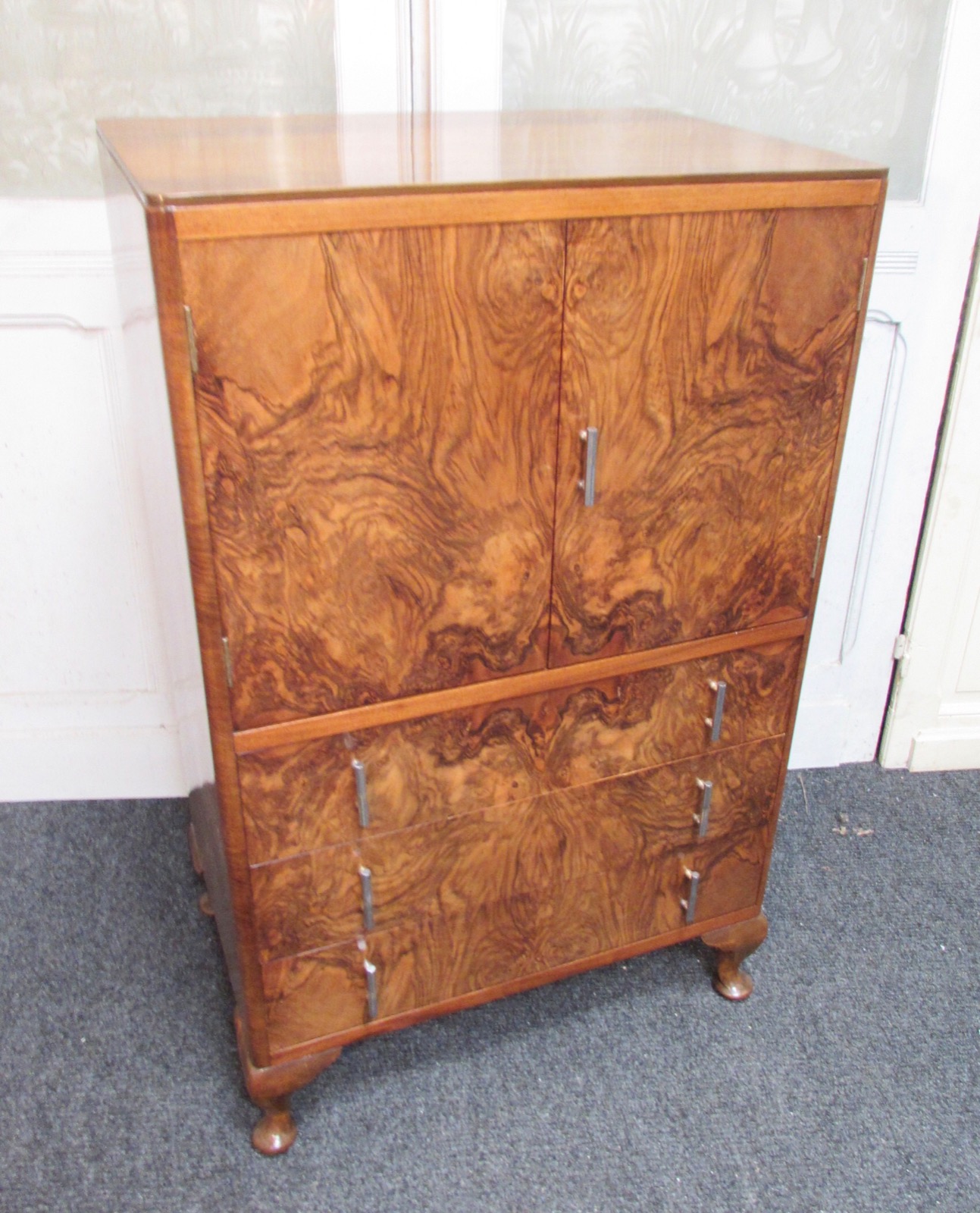 A sweet Art Deco cupboard over chest of drawers or small linen press for the bedroom. Made from walnut with nice burrs. The drawers all run smoothly and the handles are original art deco, she sits on Queen Anne feet.