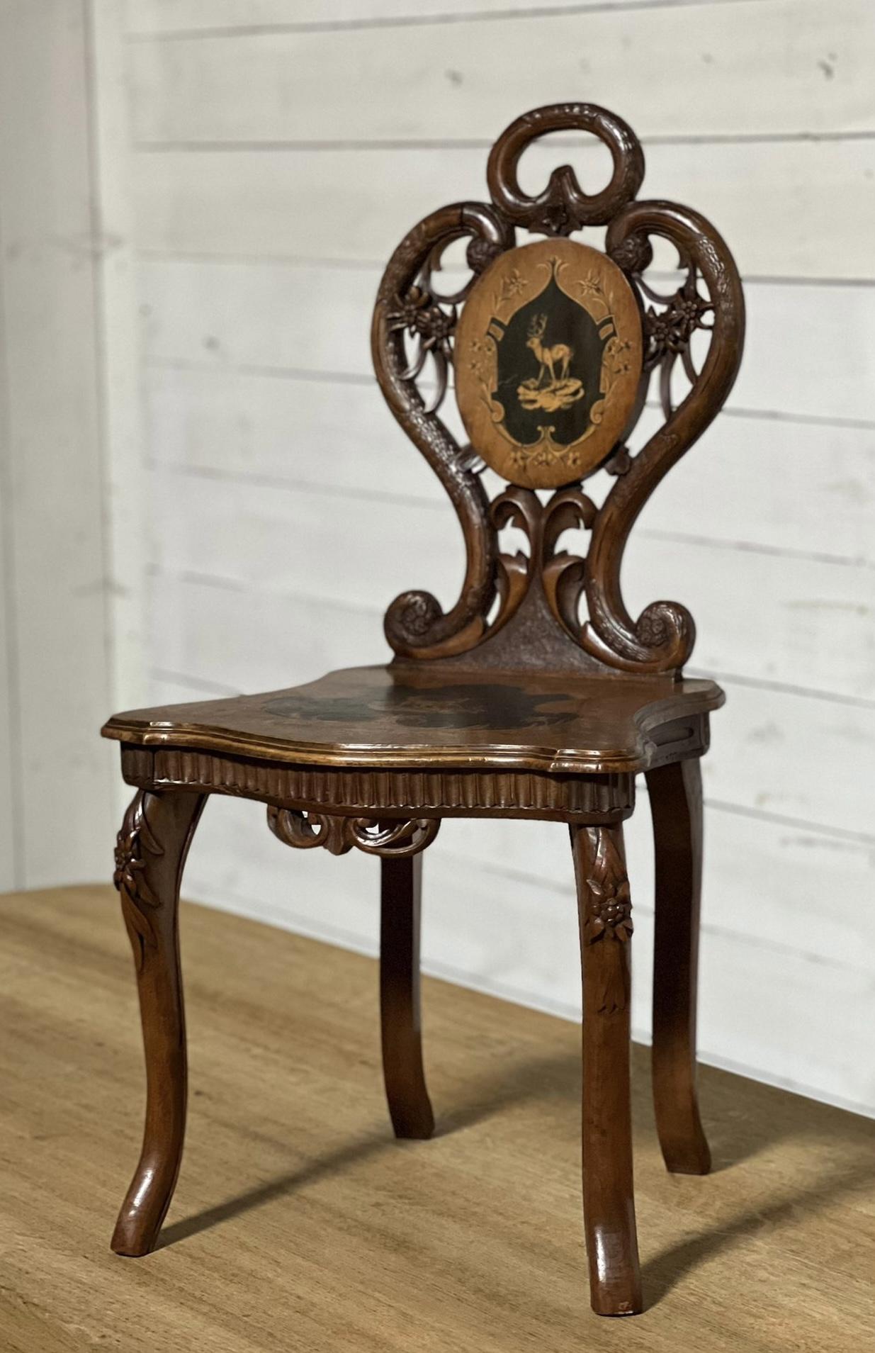 This is a beautiful Swiss Black Forest carved chair having intricate inlays depicting stags and mountain goats. Made from Walnut and various woods in the inlays.