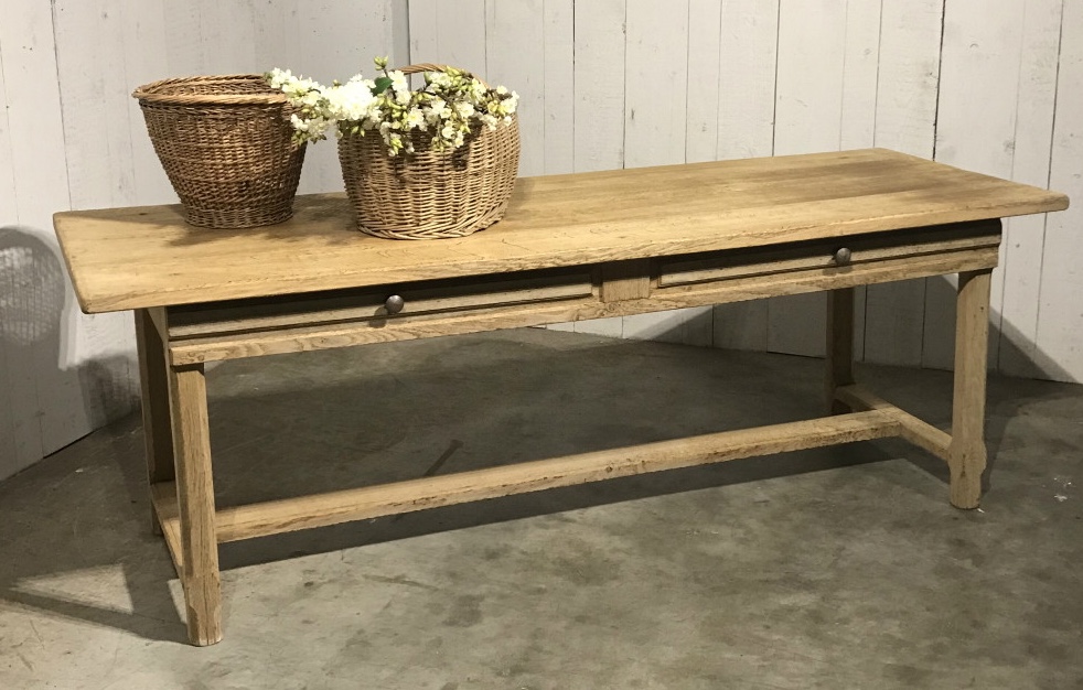 A French 19th Century Solid Oak Kitchen Farmhouse Table. Having 2 sliding door fronts along the side with compartments inside. The table is strong and sturdy and has been bleached for the modern look but can be waxed to any shade.
