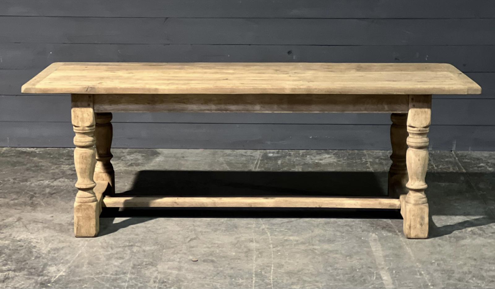 This is a very good quality French solid oak refectory farmhouse dining table. Excellent quality construction, all the joints are pegged this table will be around for generations to come. We have bleached it for a lighter look and to bring out the natural beauty of the wood.