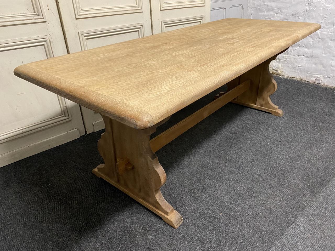 A French Oak Trestle end Refectory Farmhouse Dining Table dating to the 1900’s. We have bleached it for a lighter look but can be waxed or coloured to any shade. The table completely knocks apart for easy access into the home.