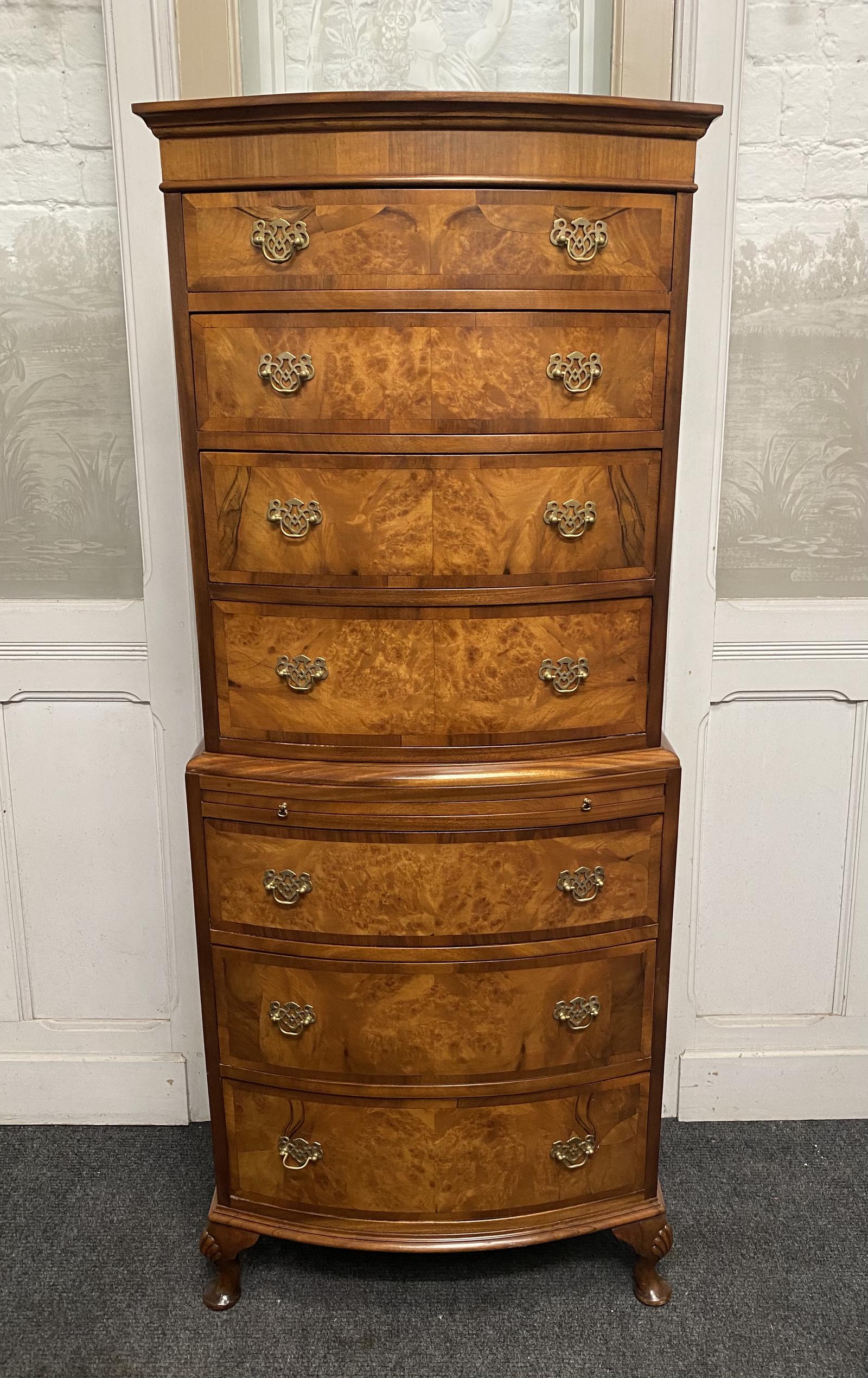Bow Front Burr Walnut Chest on Chest of Drawers