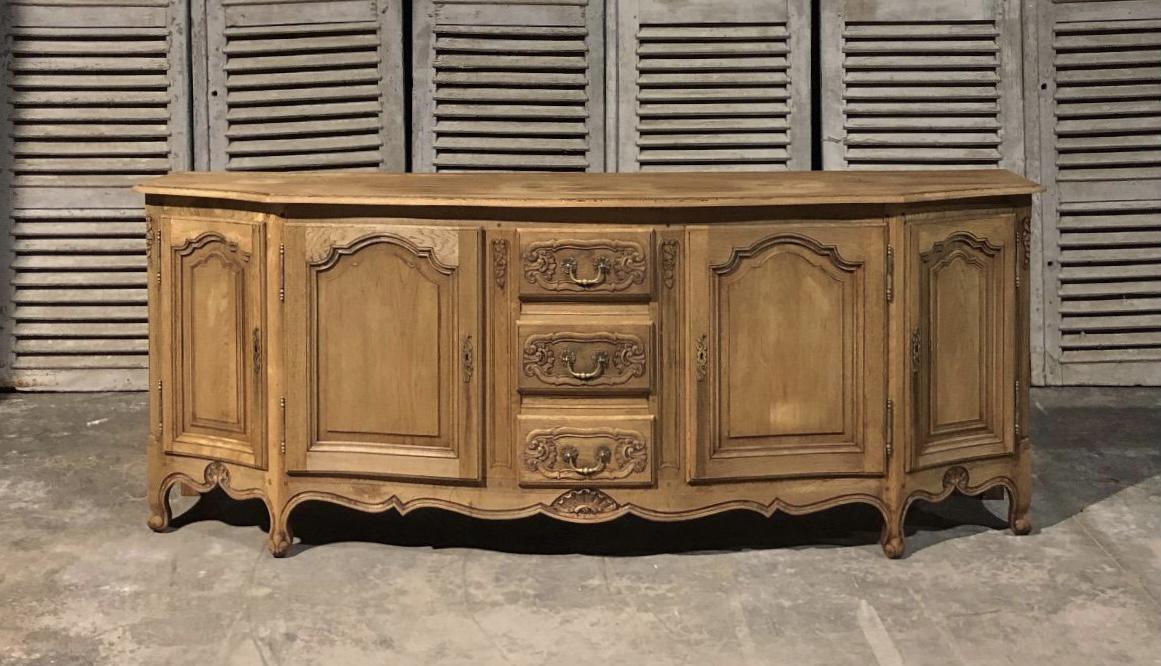 A rare large French Bleached Oak Enfilade, Sideboard or Dresser Base, these are always flat front so this is rare. Would be great in a farmhouse style kitchen. Dating to the early 1900s and of excellent quality construction.