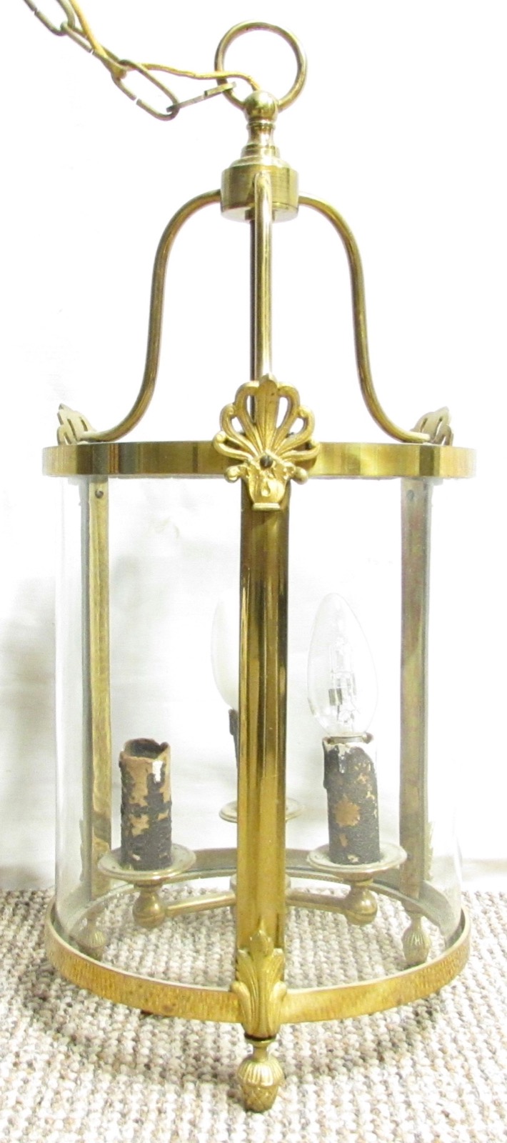 An excellent quality ceiling lantern, French in origin, made from solid Brass with 3 curved glass panels. Fitted for 3 electric lights but not tested etc so would need an electrician to fit the light up. Has its original ceiling rose and chain. These are getting very hard to find now and this is a particularly nice example.
