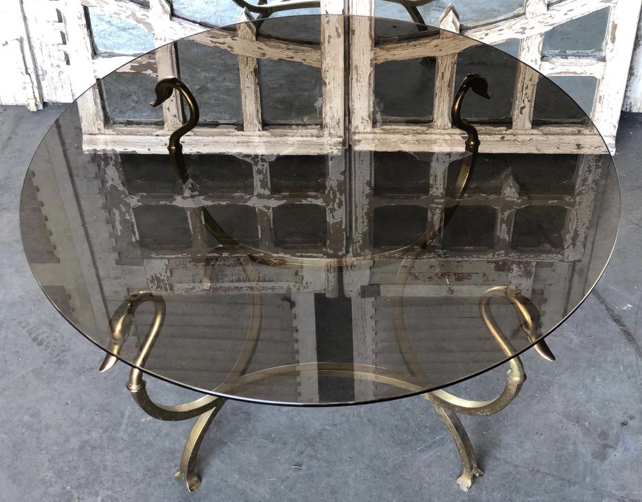 A wonderful piece of Hollywood Regency design from the 1970’s a round Brass and Smoked Glass Coffee Table, the brass base has Swans heads and feet, a real piece of retro from France. This is a fabulous quality piece.