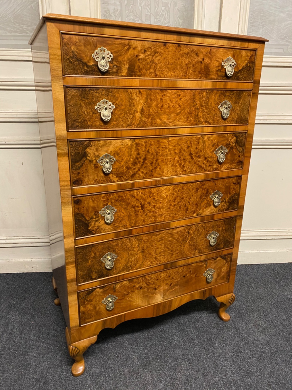 A lovely 'Queen Anne style' chest of drawers made from walnut and having nice burr walnut to the front and top. The 6 drawers all run smoothly and fitted with original stylish brass handles.