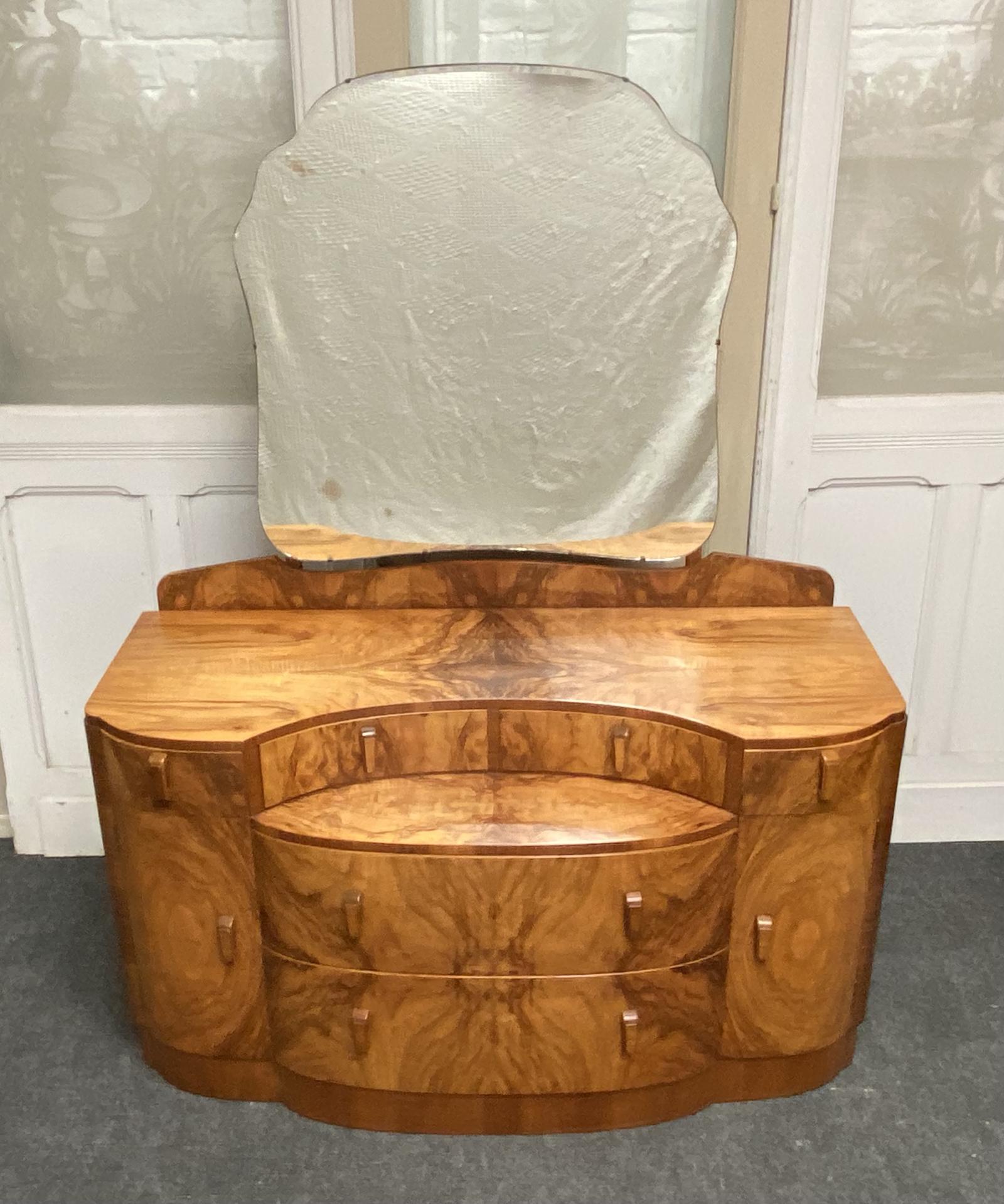 A superb stylish original Art Deco burr walnut dressing table. Lovely shaped front, art deco handles, plenty of drawers and 2 cupboards.