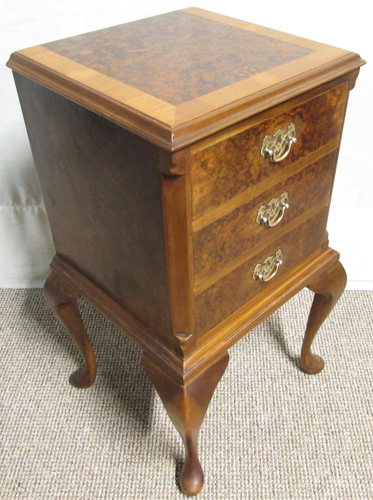 A nice quality Bedside Chest of drawers or table, made from Walnut with excellent tight Burr Walnut to the top, front and sides, cross banded with straight grain walnut. the drawers run smoothly and fitted with original Brass handles. She sits on Queen Anne Legs.