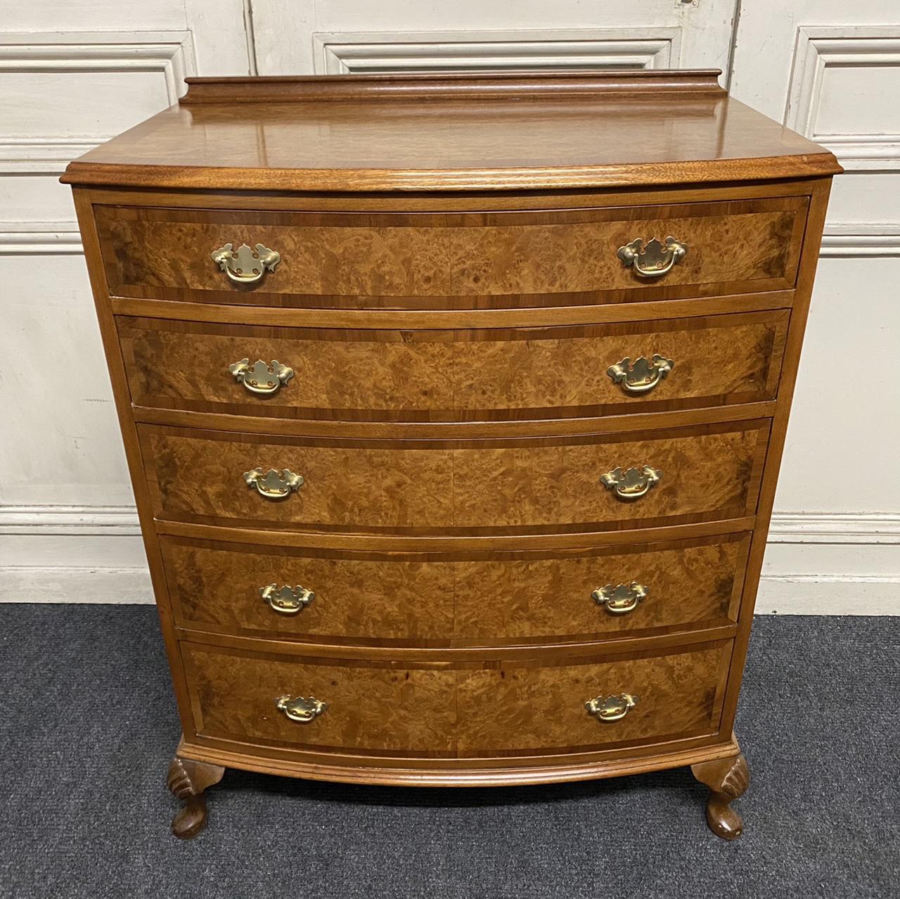 A pretty Burr Walnut Queen Anne Style Chest of Drawers, dating to the 1920’s and bow fronted in form. All the drawers run smoothly fitted with original brass handles. Nice burr walnut and cross banded.