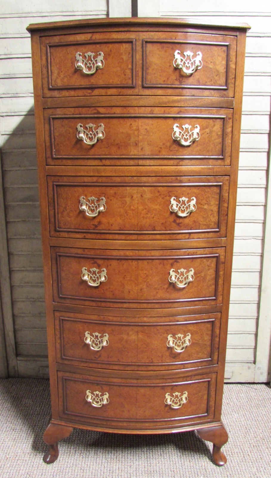A lovely Chest of Drawers, the front is bowed and all the drawers run smoothly fitted with original brass handles. She sits on Queen Anne feet.