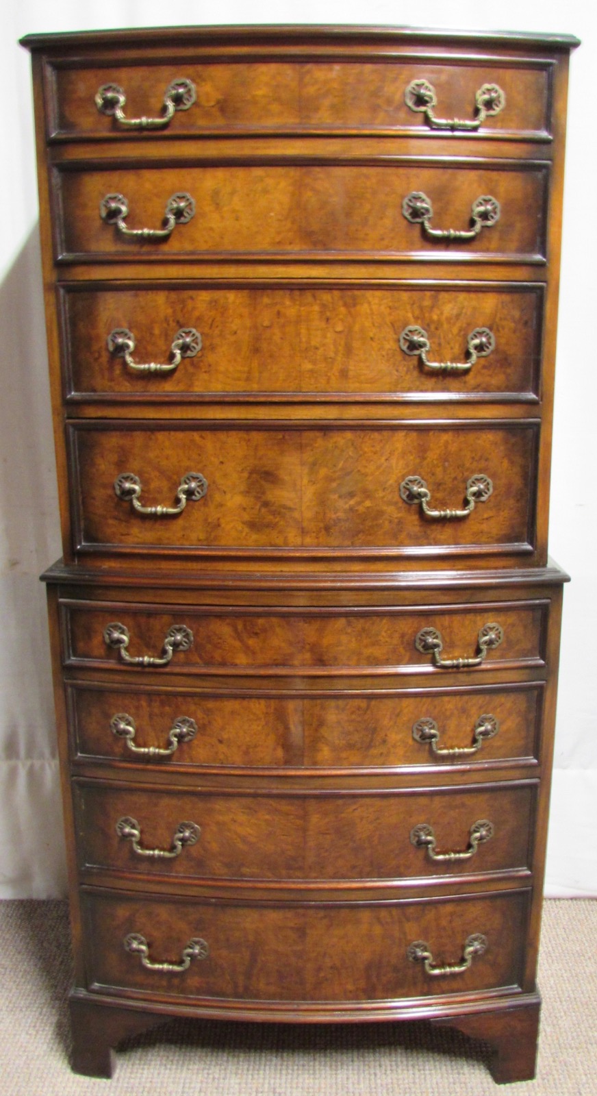 This is a nice quality chest on chest of drawers or tallboy, made from walnut with nice burr walnut veneers. Bow front in form and sitting on bracket feet. All the drawers run smoothly and fitted with original Brass handles.