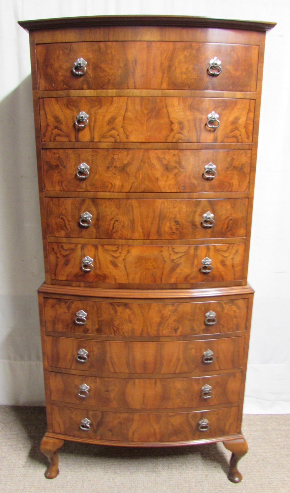 This is a delightful tallboy or chest on chest of drawers, Queen Anne in design and bow fronted. Made from walnut with nice burr walnut. All the drawers run smoothly and fitted with original handles.