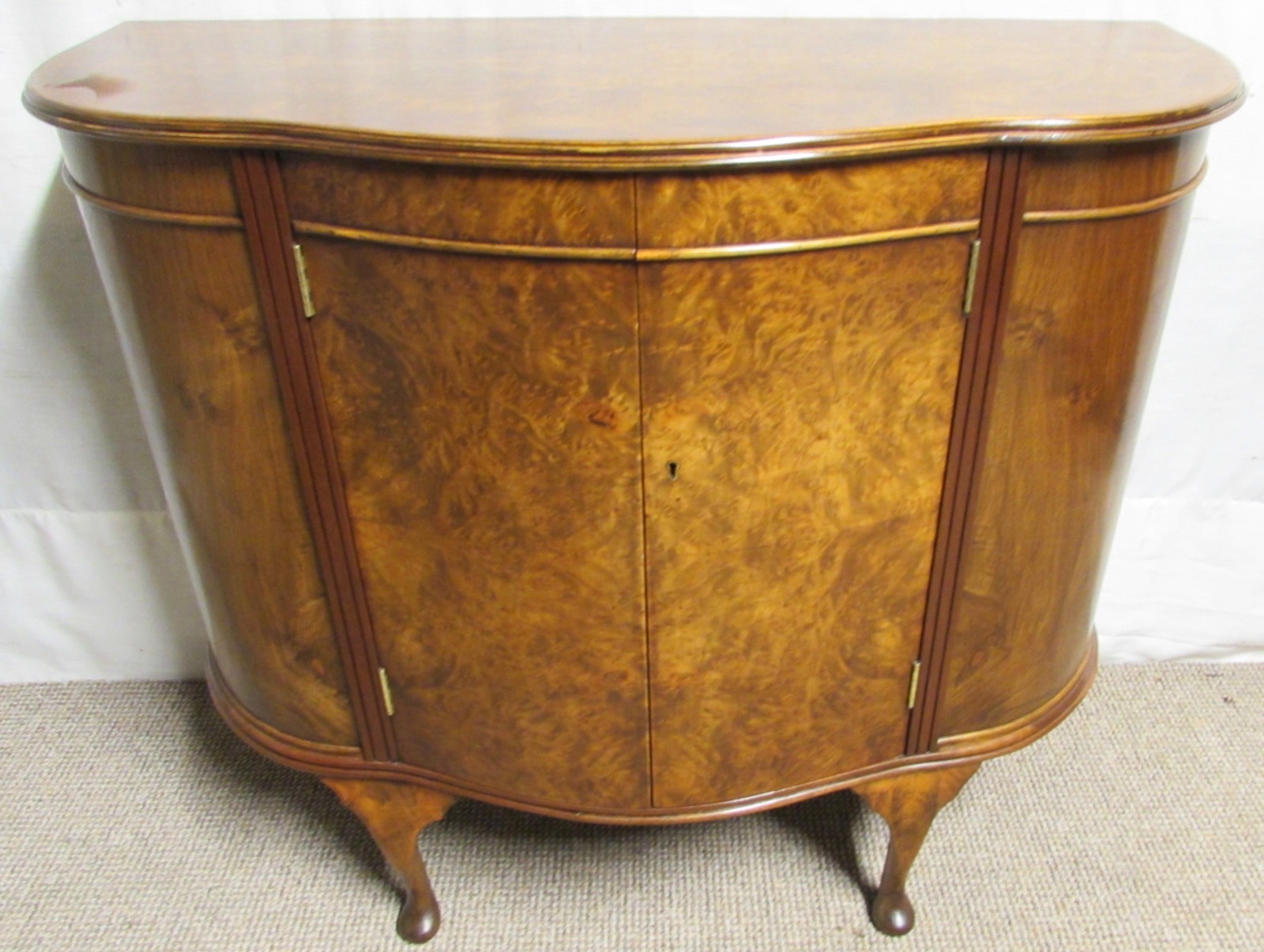 A lovely and useful Cupboard or Cabinet, made from Walnut with nice Burr Walnut. The 2 central doors are lockable (key present) and she sits on Queen Anne feet. Lovely shape to the front.
