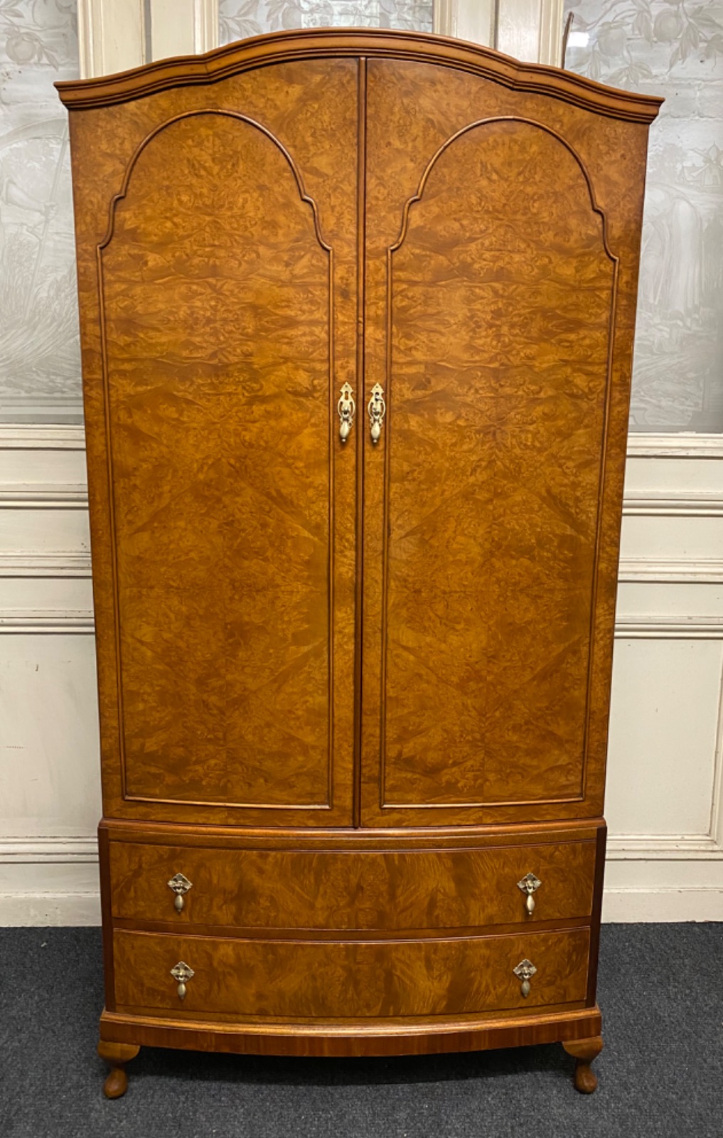 A rare Bow Fronted Queen Anne Wardrobe. Made from Walnut with nice burr walnut to the fronts. The 2 doors open to reveal hanging on the left and shelves on the right, the doors are lockable, key present. The drawers under run smoothly and all the hardware is original brass.