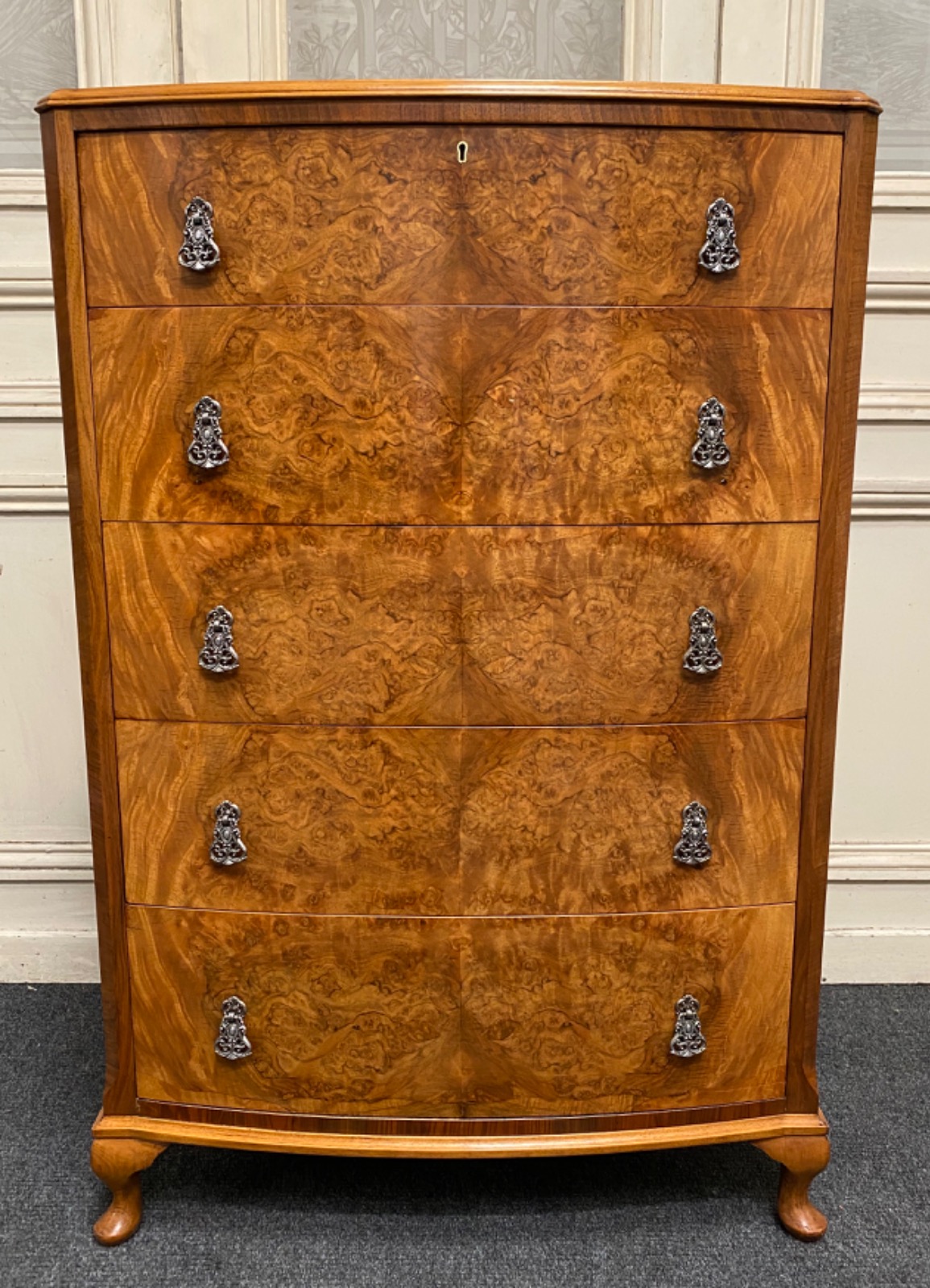 A superb bow fronted chest of 5 drawers made from walnut with excellent burr walnut to the fronts. All the drawers run smoothly fitted with original handles. She sits on Queen Anne feet.