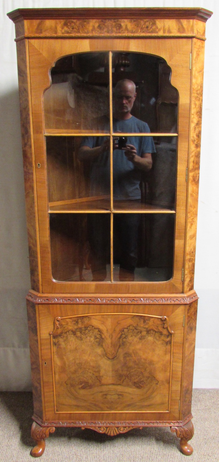 This is a superior quality Corner cabinet made from walnut with excellent burr walnut. Both doors are locked (keys present). The carving is crisp and well executed and she sits on Queen Anne feet.