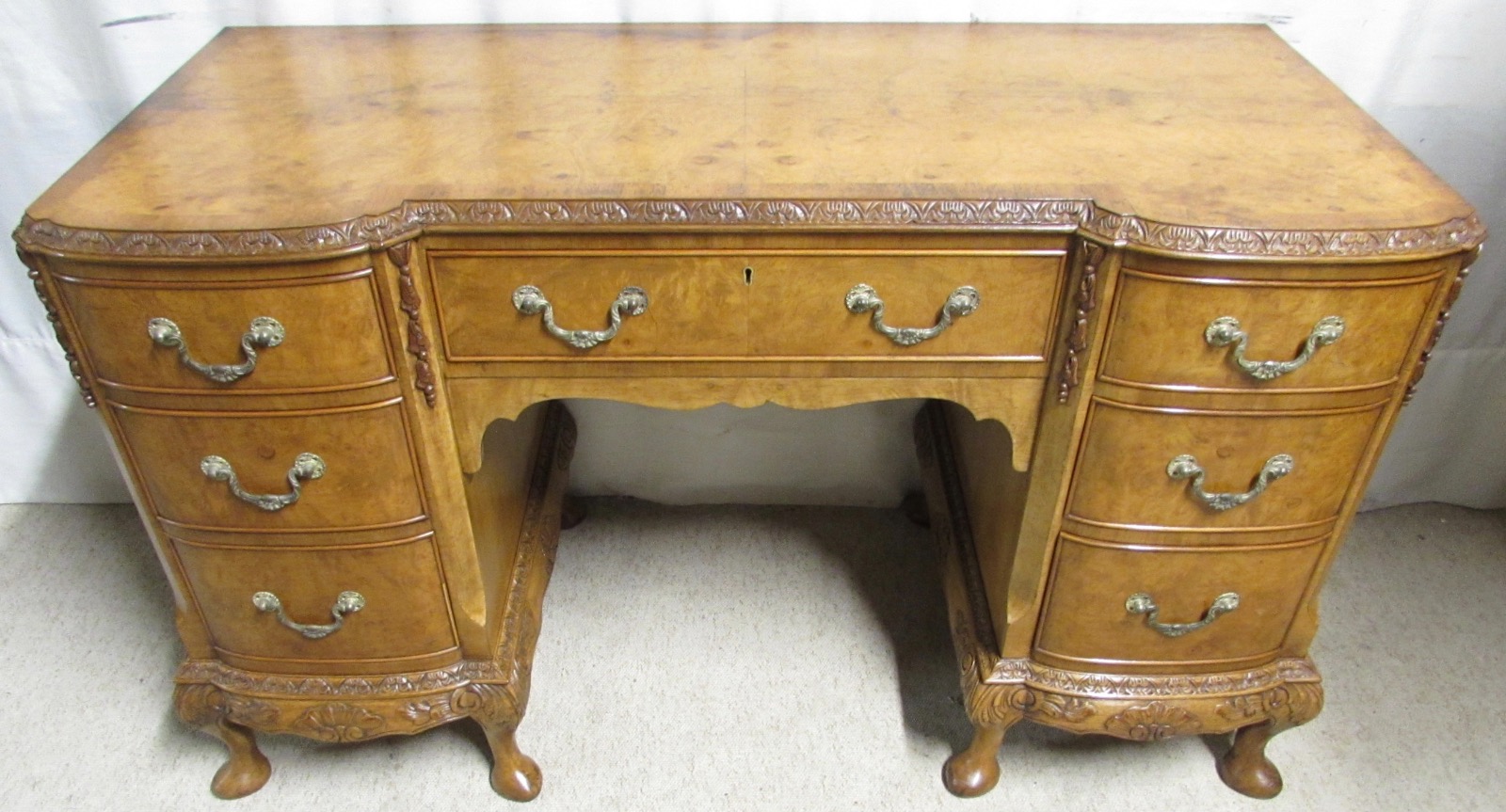 This is a lovely quality burr walnut desk or dressing table. made from solid walnut with excellent burr walnut veneers. Lovely crisp carvings around the base and the top. All the drawers run smoothly and are fitted with Brass handles. The front is nicely shaped and it sits on Queen Anne feet. This is a high quality piece, the drawers are made from solid mahogany with nice dovetails.