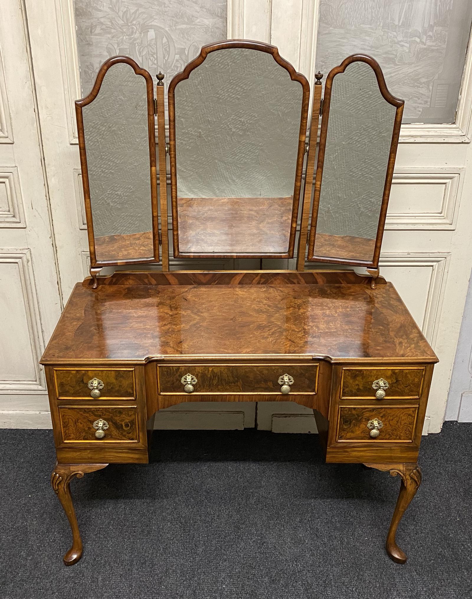 A lovely Burr Walnut Queen Anne Dressing Table, having 3 mirrors that move independently, all the drawers run smoothly fitted with original brass handles.