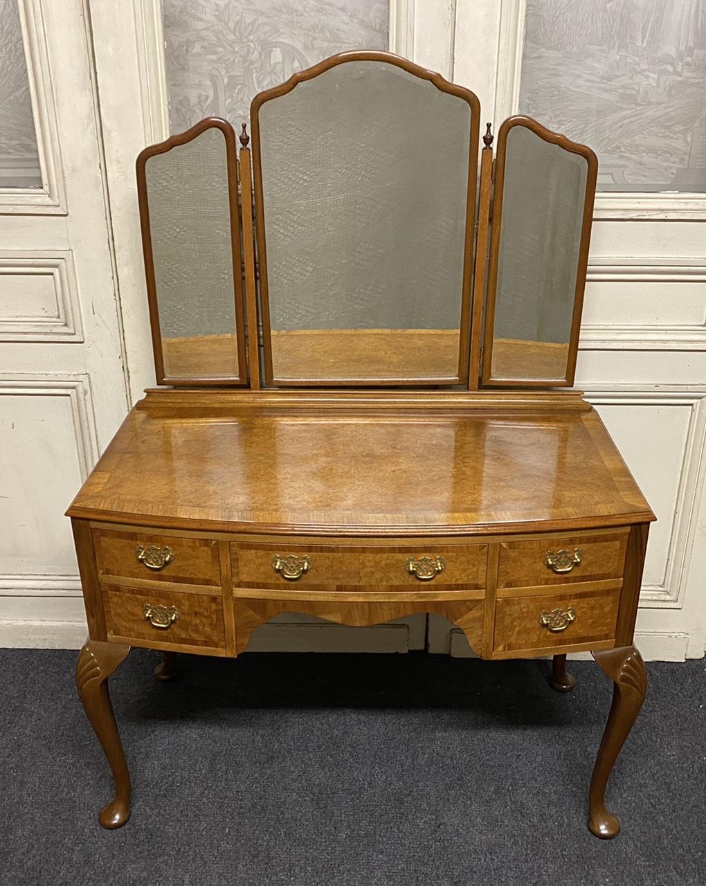 A lovely Dressing Table made from Walnut with nice Burr Walnut to the tops and front. Bow fronted in form and having 3 mirrors thats move independently, all the drawers run smoothly fitted with original brass handles.