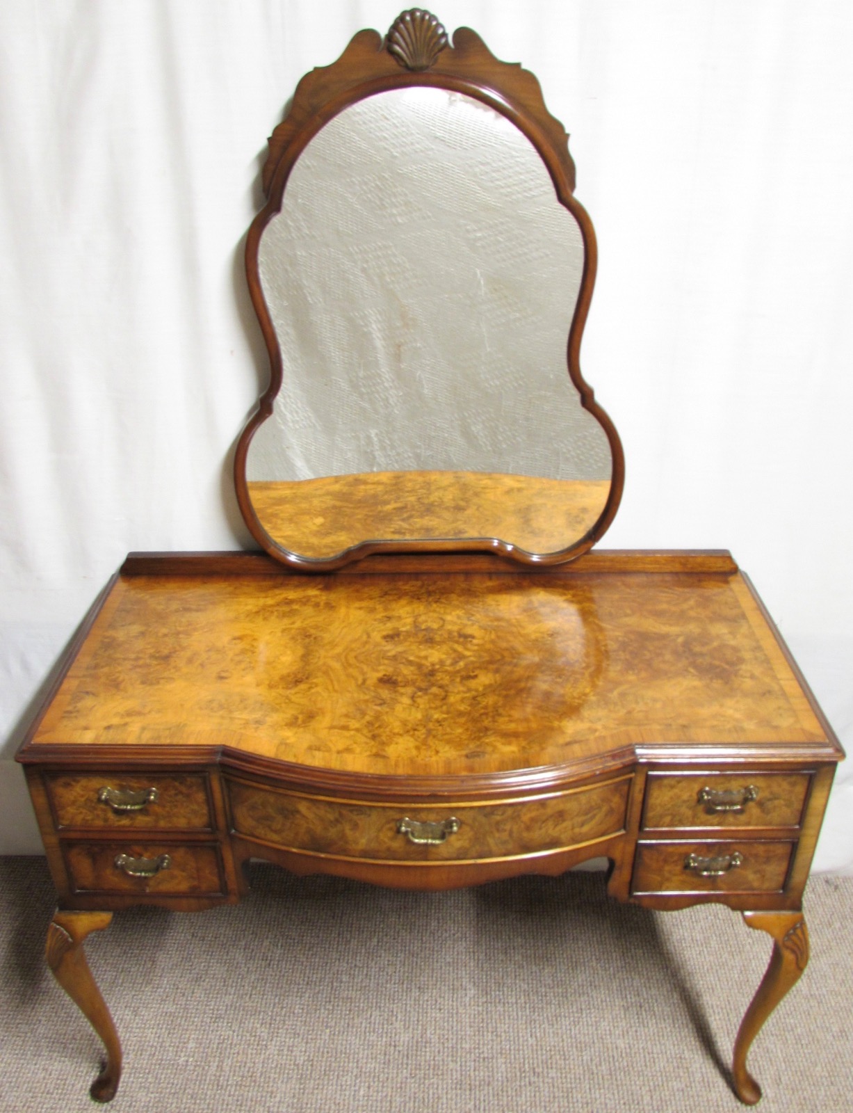 This is a nice dressing table made from walnut with excellent burr walnut veneers. The unusual mirror has a solid walnut frame and original plate which is in good condition with just a very few minor spots which aren't noticeable. The base has 5 drawers which all run smoothly and fitted with original brass handles. She sits on Queen Anne Legs.