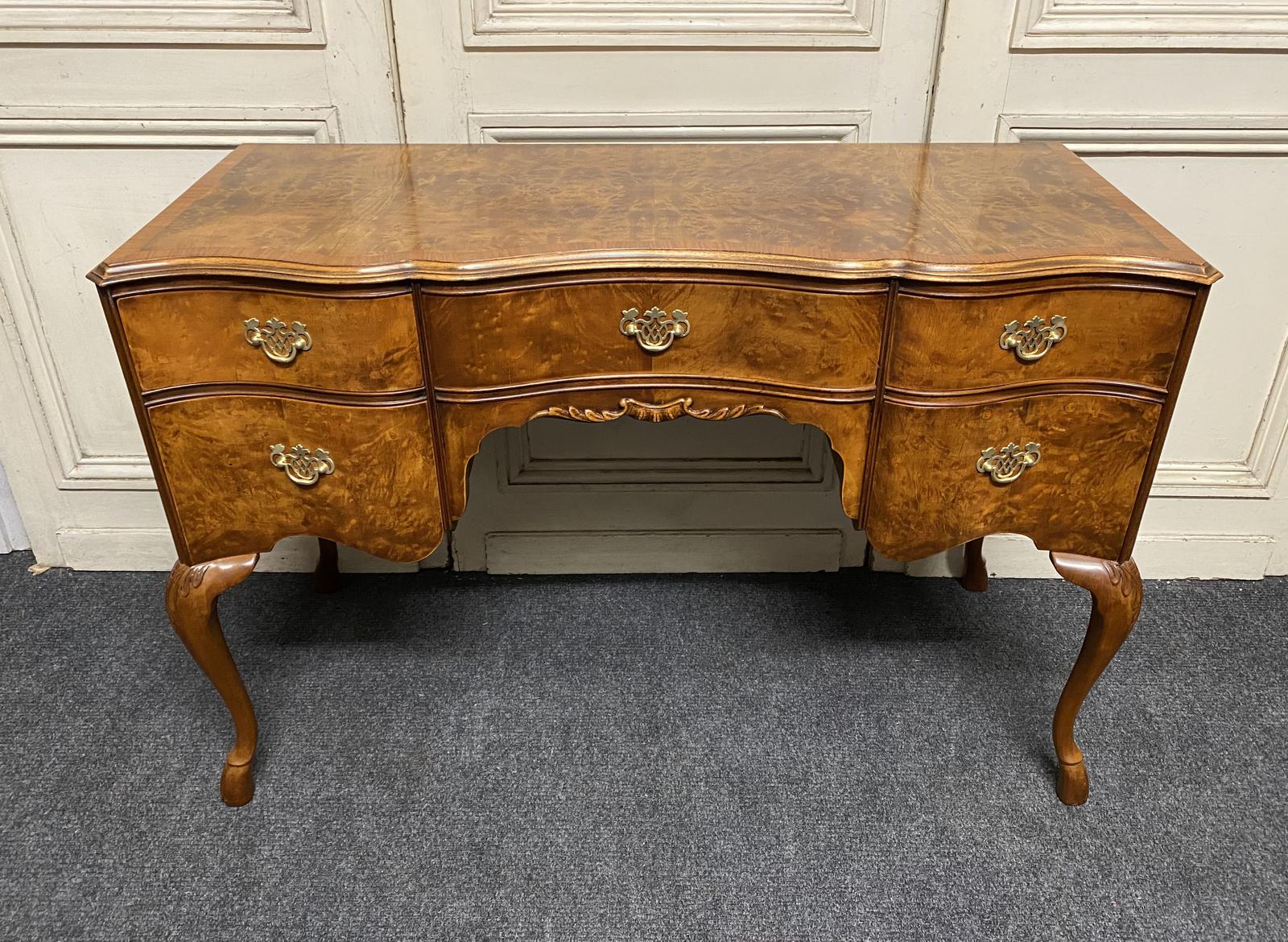 A pretty Burr Walnut Dressing Table or would make a desk, very good quality by Waring & Gillow (see label). All the drawers run smoothly fitted with original brass handles. Nice shaped front, cross banded top and sitting on hoof feet.