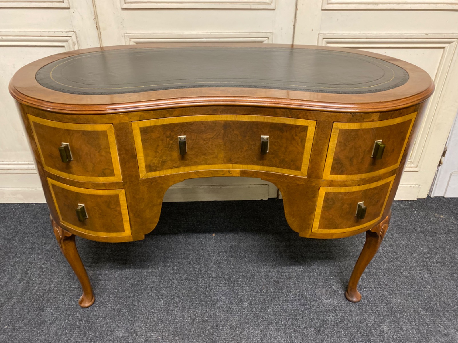 A wonderful quality Burr Walnut Kidney Desk, having 5 smoothly running drawers fitted with original stylish Art Deco handles. She sits on Queen Anne legs with shell motifs. The desk is finished right round so can be freestanding in a room.