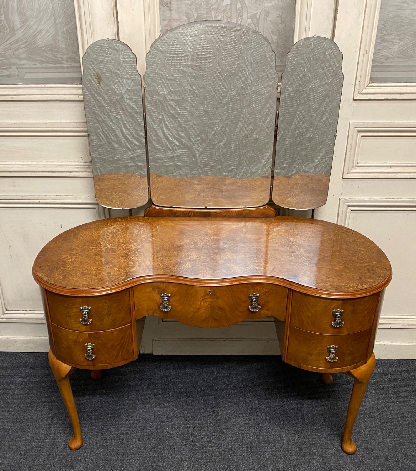 A lovely Kidney shaped Queen Anne Dressing Table, made from Walnut with excellent burr walnut. The 3 mirrors all moved independently and the glass has been replaced so in perfect condition. The drawers all run smoothly and fitted with original handles.