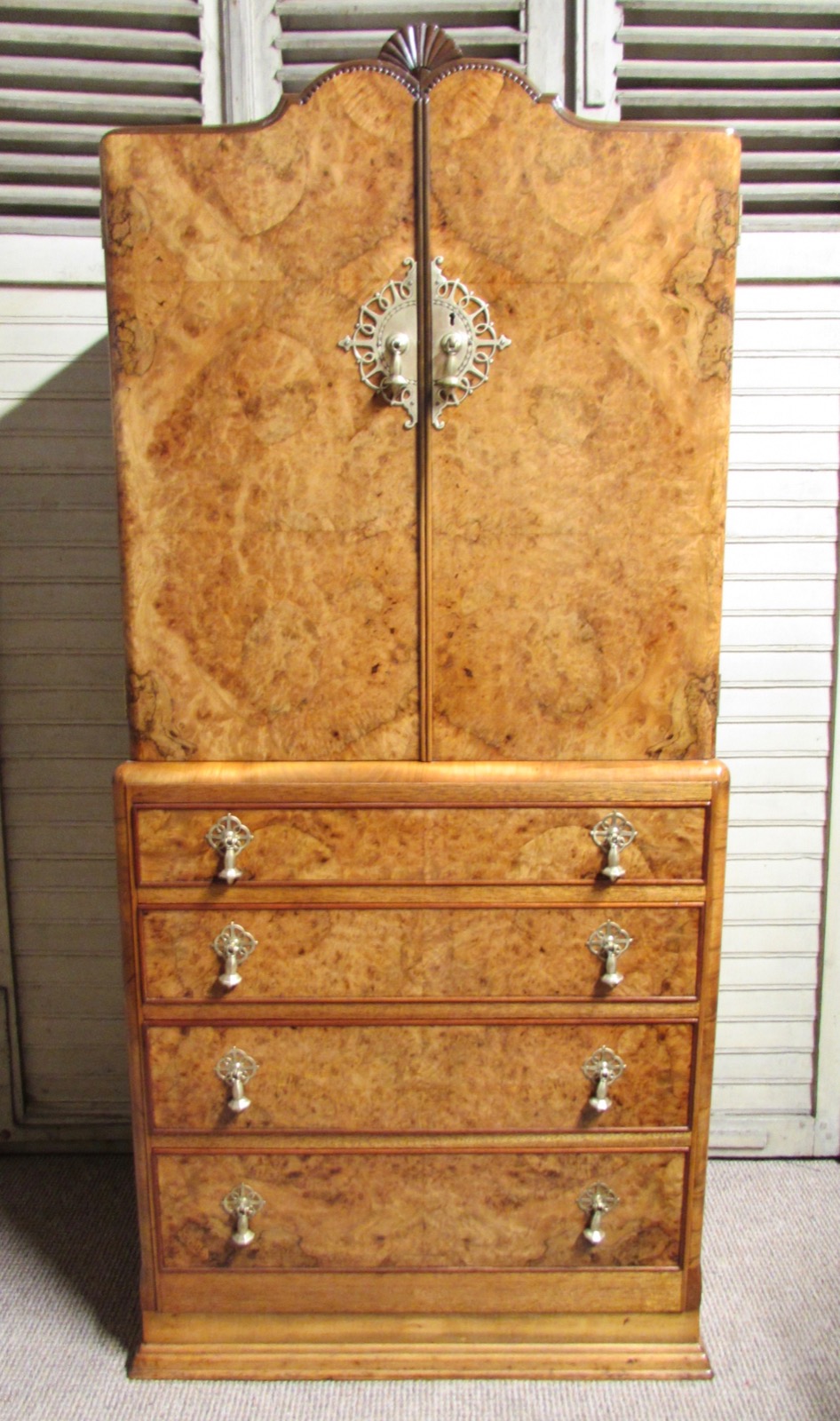 A very high quality Linen Press or Cupboard over Chest of Drawers. Made from Walnut with fine tight Burr Walnut.