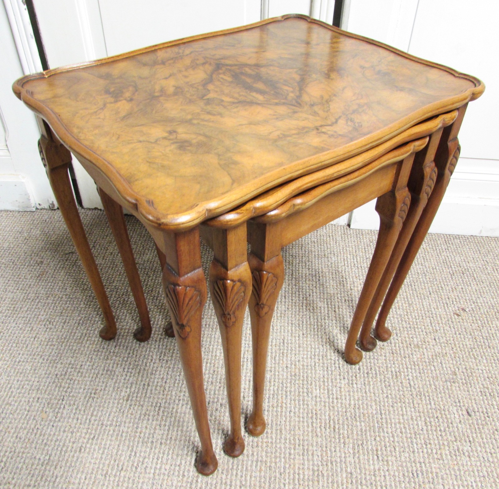 A pretty nest 3 of tables made from Walnut with excellent Burr Walnut tops. The tops are also shaped, a nice feature and they sit on Queen Anne legs. All 3 tables are sturdy.