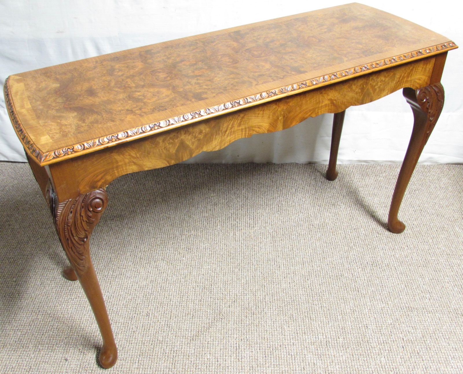 A very nice quality Centre or Console Table, made from Walnut with excellent Burr Walnut top. Of the Queen Anne design most notably the legs. This table is the same right round hence being a free standing centre table but would also wok well as a console, lamp, hall or side table. The carved decoration to the knees and around the top is crisp and well defined. The top is also cross banded in Walnut.