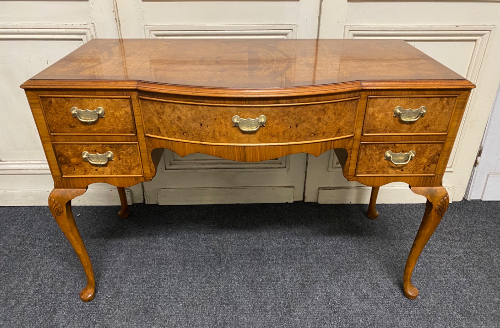 A pretty Queen Anne Dressing Table or could be a Writing Table. The 5 drawers all run smoothly and fitted with original brass handles. Made from Walnut with nice Burr Walnut and a cross banded top.