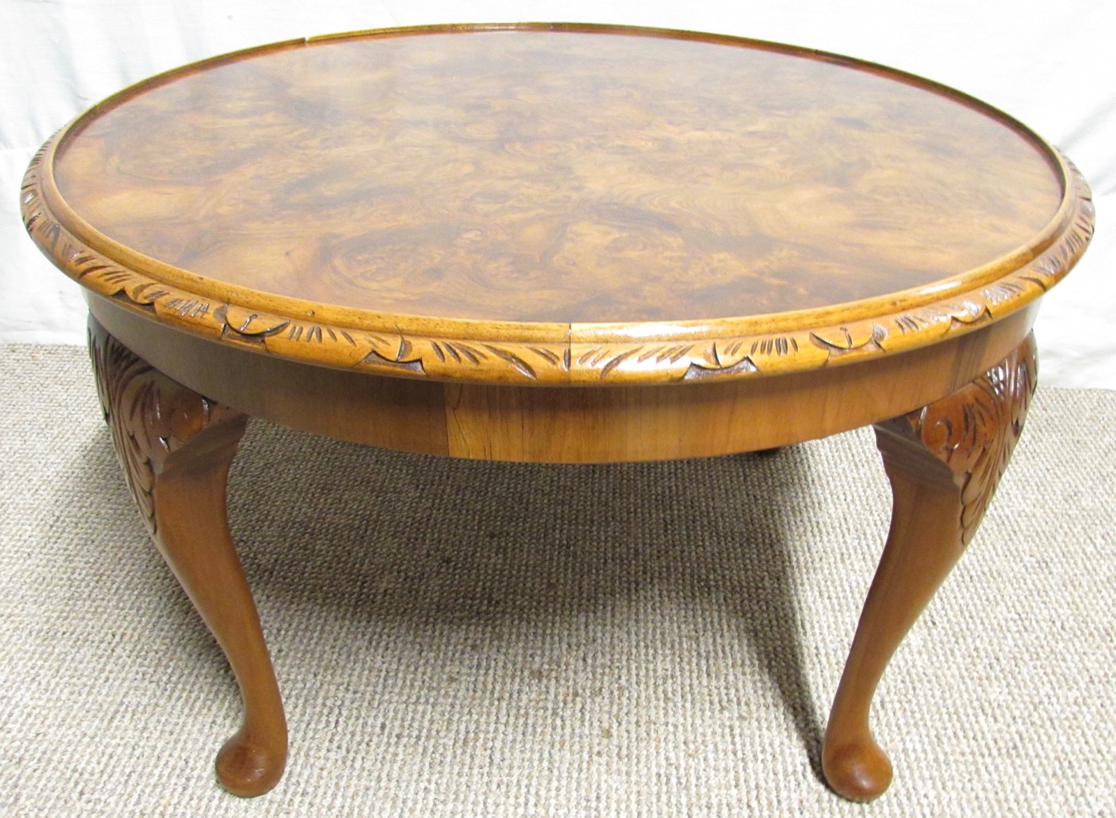 This is a lovely Queen Anne coffee table made from solid walnut with nice tight burr walnut to the top, the carved decoration is crisp and she sits on Queen Anne legs.