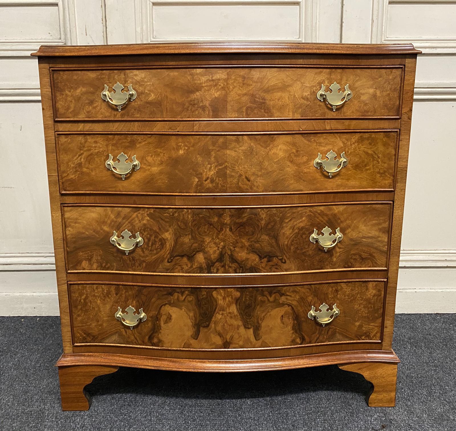 A pretty Burr Walnut Chest of Drawers, serpentine in form to the front. All the drawers run smoothly fitted with original brass handles.