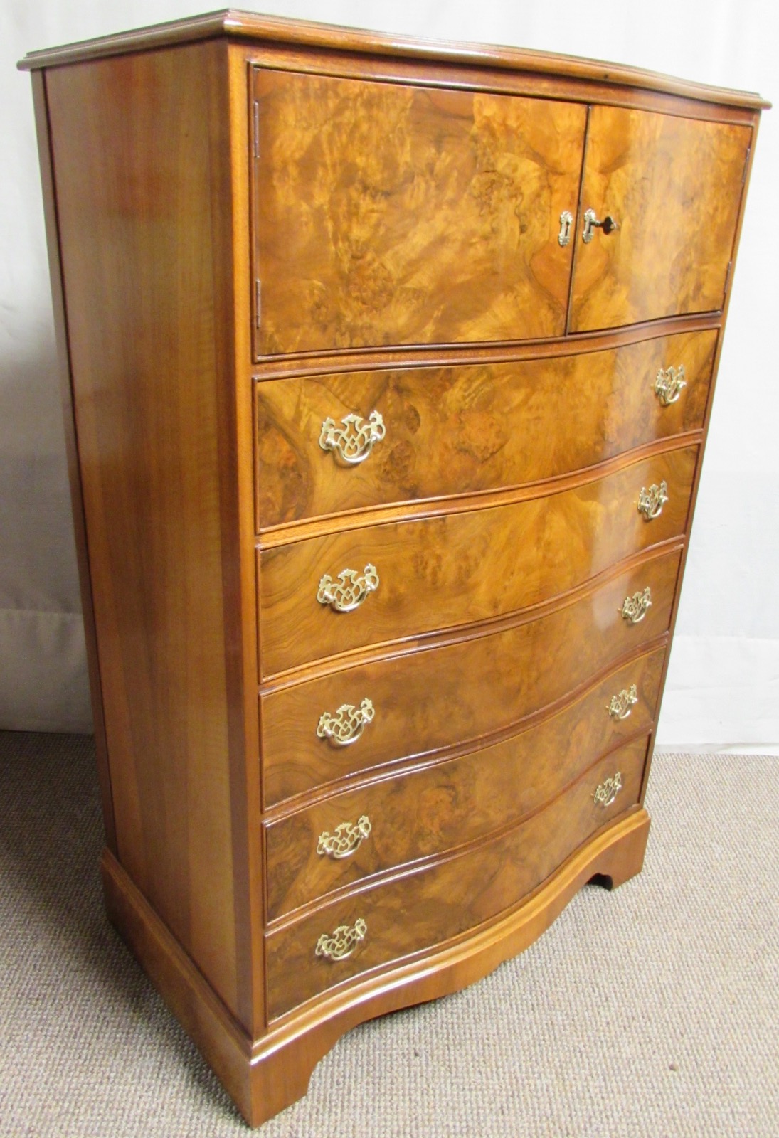Burr Walnut Serpentine Chest of Drawers with Cupboard Over
