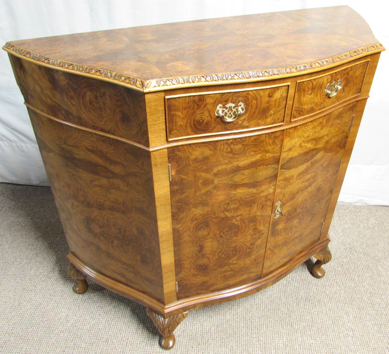 This is the finest quality of the period and would have been sold by a good London retailer. The Cabinet or Cupboard or even Sideboard is serpentine in form and covered in excellent burr walnut. It has 2 smoothly running drawers over a pair of lockable (key present) cupboard doors and provides plenty of storage. The carved decoration to the feet and around the top is crisp and well executed. This internal structure of the piece is of excellent construction and the quality shines out.