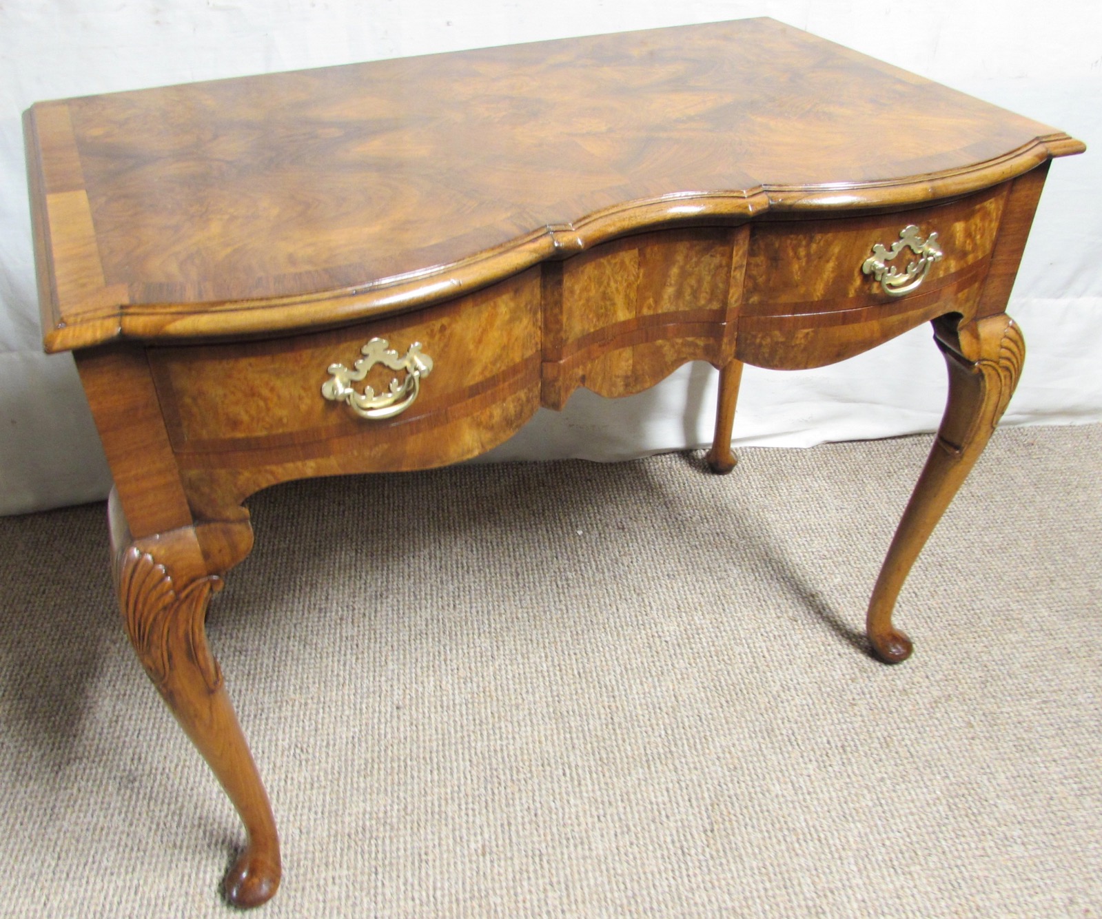 This is a lovely quality side, hall or writing table made from walnut with burr walnut to the top and front. The single drawer is smoothly running and fitted with original handles. The top is cross banded and she sits on Queen Anne legs.