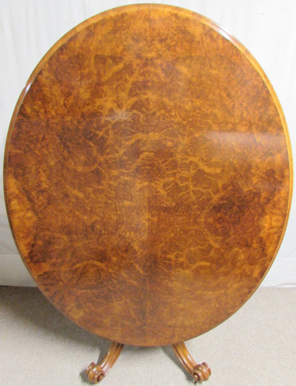 A very good quality Loo or Dining Table made from Solid Walnut with the best Burr Walnut to the top. Oval in shape and seating 6 people. The top tilts up so can be pushed the side of a room if required. The table is very sturdy and made to the highest Victorian standards.