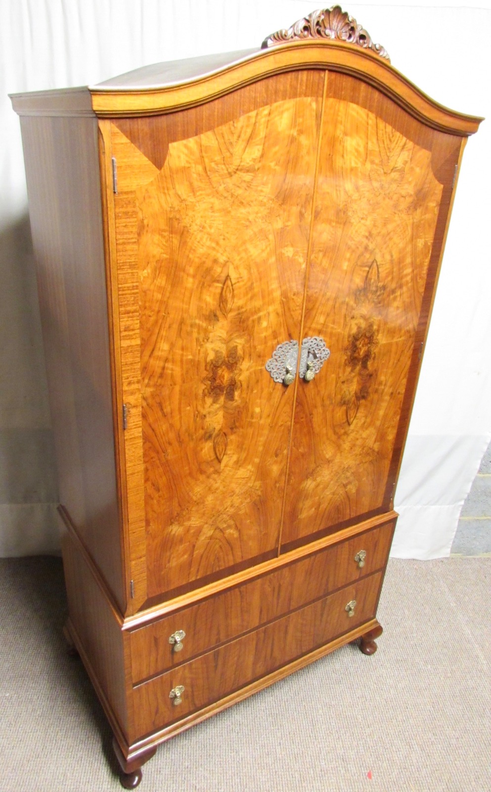 A very nice quality Wardrobe made from Solid Walnut with exceptional Burr Walnut Veneers. The 2 lockable (key present) doors open to reveal plenty of handing space and having 2 doors underneath, Nice Brass lock plate and carved crest sitting on Queen Anne feet.