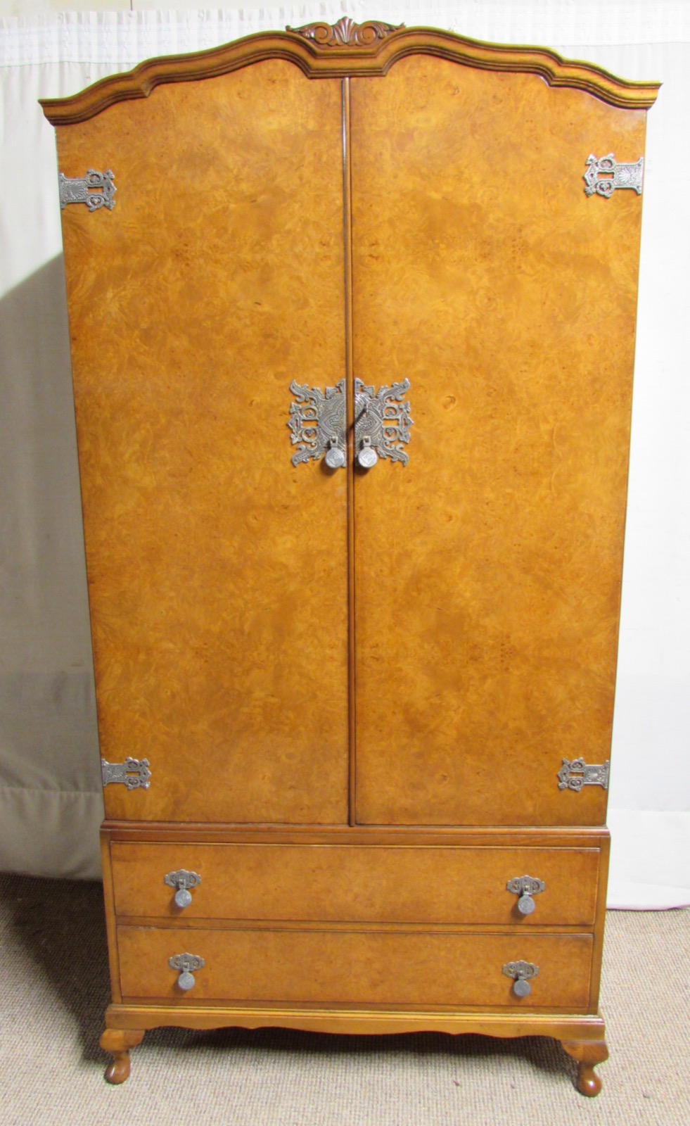 A lovely wardrobe dating to the 1920's. Made from Walnut with excellent tight Burr Walnut veneers. Made and retailed originally by Maple & Co (label inside) the famous and number one company from the period hence the quality. The lockable doors (key present) open to reveal a hanging area and a shelved side, underneath the drawers run smoothly. Lovely original hardware including the nice lock plate. Queen Anne in design.